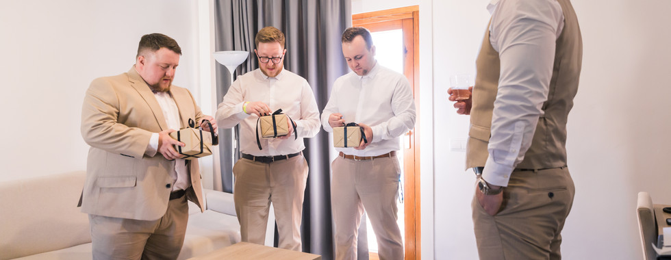 El novio, junto con sus amigos, estaba muy elegante con un traje beige y una pajarita de seda. Mientras se vestía, aprovechó para abrir un regalo que Amber le había dado para ese momento. En él había un reloj precioso y unos bóxers que nos dejaron alucinando donde leíamos: 'Propperty of: Mrs. Amber Greenwood'. ¡Muy gracioso!